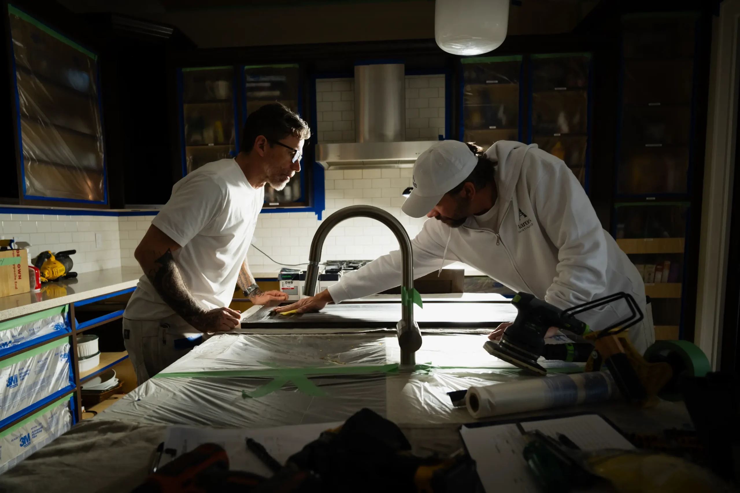 We take your existing cabinets through a complete restoration process: deep cleaning and degreasing, sanding, primer, and two coats of durable, sprayed-on cabinetry and millwork paint for a smooth, factory-quality finish. Every inch is protected, and every step is handled with care.